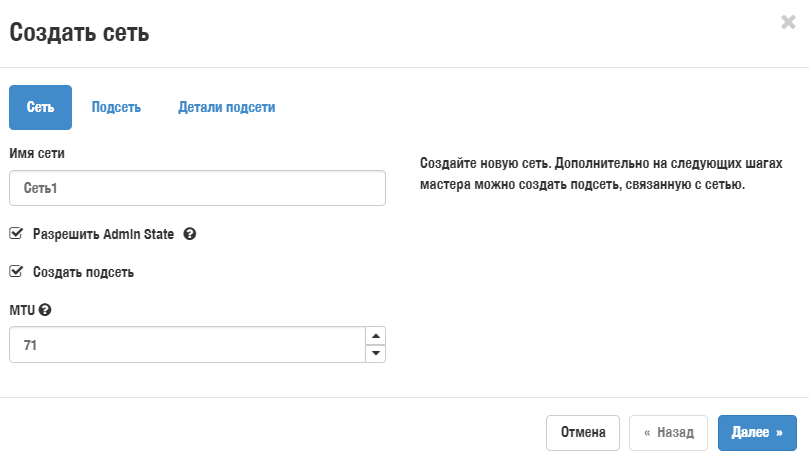 Создать подсеть (опционально) — включите это опцию, если нужно сразу создать подсеть. В этом случае в окне создания сети после нажатия на кнопку Далее нужно будет указать параметры сети. Если подсеть не требуется, то опцию нужно отключить. В этом случае будет создана только сеть. При этом подсеть можно будет создать отдельно.