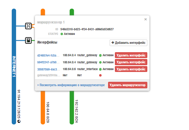 Для просмотра информации об элементах сетевой инфраструктуры на схеме Сетевой топологии нажмите на любую сеть, подсеть или инстанс, чтобы просмотреть детальную информацию.