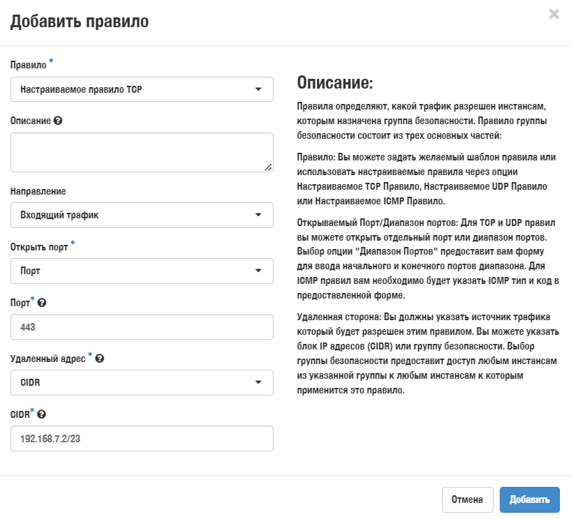- Группа безопасности — существующая группа безопасности. Правило применяется для серверов, которые используют выбранную группу безопасности. Нажмите на кнопку Добавить.